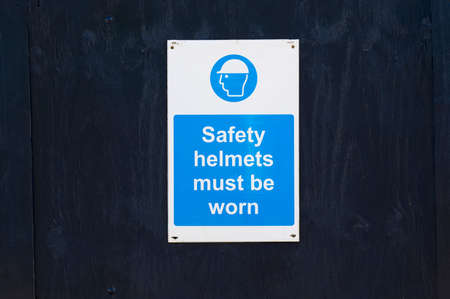 A close-up of a safety helmet sign on a construction site, indicating safety regulations and practices essential for the protection of workers.