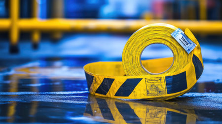Roll of barrier tape on construction site floor with safety instructions visible