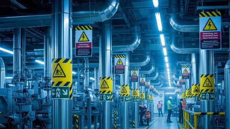 Interior of a modern industrial facility with numerous pipes, warning signs, and workers present, illuminated by blue lighting.