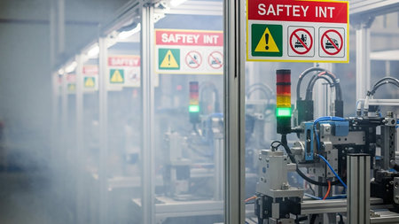 A close-up of an industrial manufacturing line with prominent safety signs and illuminated indicator lights.