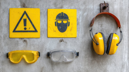 Safety signs and personal protective gear mounted on wall at job site entrance