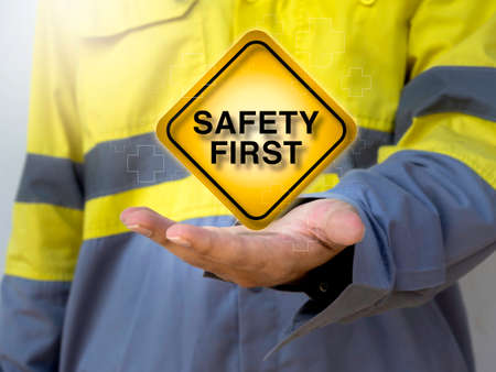Work safety concept. Word Safety first sign and aid symbol on square yellow sign on hand of engineering people wearing yellow high visibility jacket.