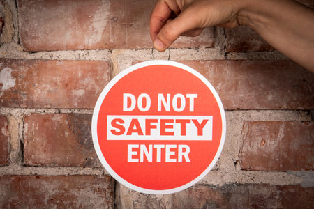 Safety Warning Sign on Brick Wall with Hand Holding Do Not Enter Label