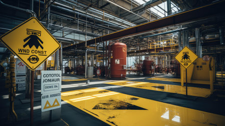 A yellow and black construction zone warning sign is prominently displayed, contrasting against a bright blue sky. The image captures workers and equipment, including a crane, at a construction site. The scene depicts an industrial environment with metal beams and offers potential applications in various commercial and editorial projects.
