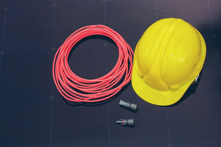 Solar Installation Tools and Safety Equipment on Solar Panel Surface.