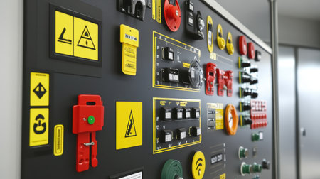 A collection of brightly colored safety vests displayed neatly on hooks in a modern industrial setting, emphasizing safety culture, organization, and workplace efficiency.