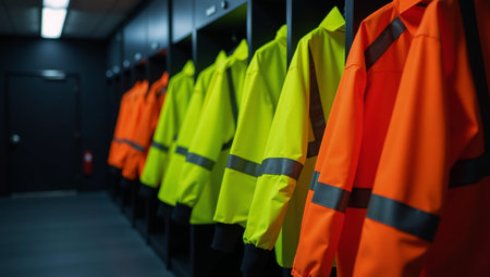 High-visibility jackets neatly arranged in dim locker room conveys readiness and safety