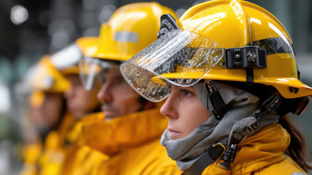 A group of firefighters are standing in a line, all wearing yellow helmets and jackets. Concept of unity and teamwork among the firefighters, as they are all dressed in the same uniform