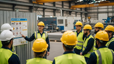 A group of workers reviewing safety protocols and regulations during the mediation meeting