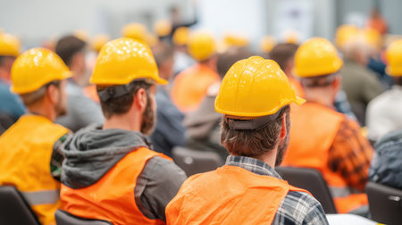 Group of attendees wearing yellow hard hats and orange vests at a safety training seminar in a large conference room indoors with blurred background