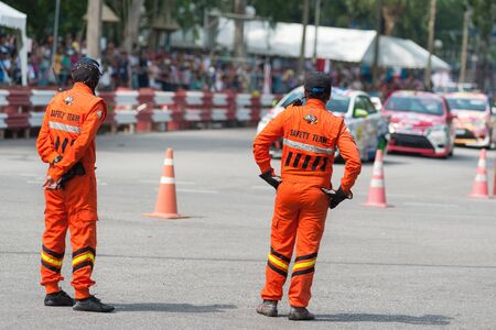 Thailand : July 30, 2019 : Peoples preparedness for fire drill and training to use a fire safety tank in the hospital. Udon Thani, Thailand.