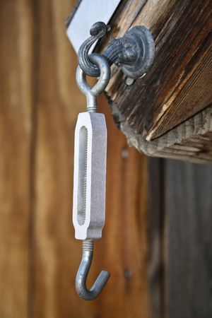 Stainless steel turnbuckles for applying tension in steel wires for clothesline. Stainless steel turnbuckle hook steel post retainer. Stainless steel turnbuckle hook and steel wire rope connection.