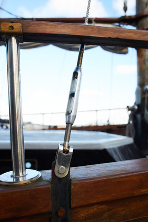 Close up of yacht equipment. Part of yacht with red ropes and capstan. Sailing boat pulley with nautical rope. Marine background.