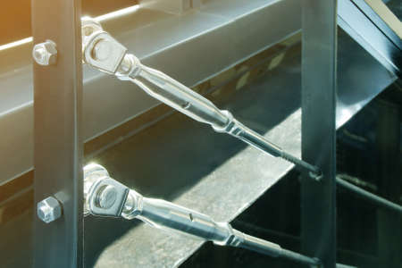 stainless steel turnbuckle hook and steel wire cable rope connection ties and connections concept. bracing and securing concept