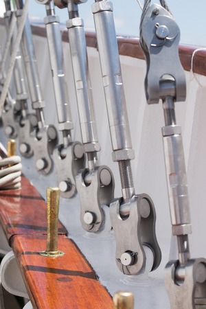rigging detail on a sailing vessel, selected focus with narrow depth of field, background blurred to white