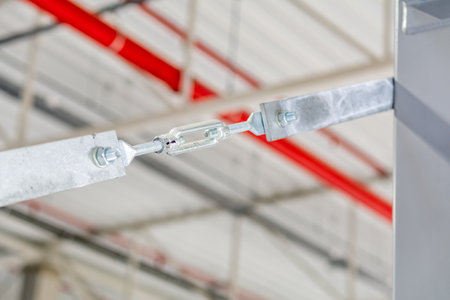 Steel cable secured with metal turnbuckle on structural beam.