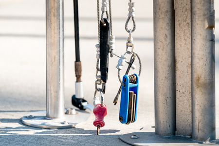 Public bicycle service station with all necessary tools and repair kit on the road in Adelaide