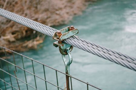 The connection of a large metal cable with a clip for the tether. The construction of a suspension metal bridge over the river