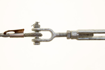 Joint hinge with a steel cable for the installation of metal exterior structures. The connection of metal loops, staples and steel ropes. Fastening and stabilization. Isolate on white background.