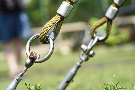 End of swinging rope hang on metal construction in a park. Rough rope end in metal circles and safety snap hook