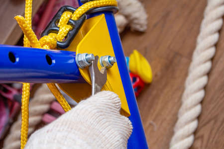 Assembling installing home gymnastic wall bars on the floor. Sport gym home concept
