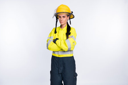 Photo of young attractive woman firefighter serious confident crossed hands wear uniform isolated over white color background