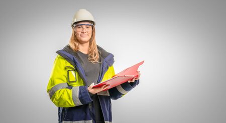 Portrait of female industrial worker in protective helmet vest on white background