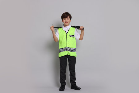 Boy pretending to be policeman on light grey background. Dreaming of future profession