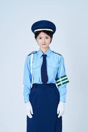 A woman in a security guard or police uniform and white background