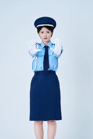 A female security guard making a pose to stop and white background