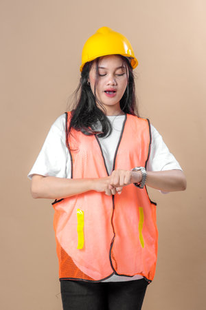 Young Asian female construction worker wearing a yellow hard hat and orange safety vest looks at her wristwatch, appearing surprised, against a plain beige background.