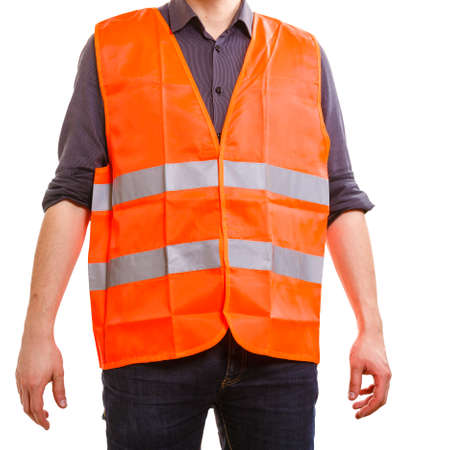 Job and work concept. Part body man worker wearing orange uniform safrty vest. Repairman inspector isolated on white.