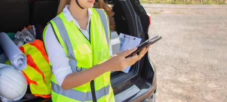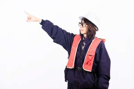 Woman construction worker builder structural engineerin in orange vest holds pen file pad. Safety in industrial work. Studio shot