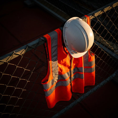 A vivid orange safety vest paired with a hard hat is displayed on a chain-link fence, symbolizing workplace safety in a construction setting with hazy blurred lights behind.