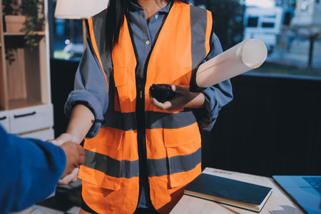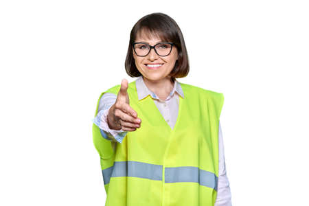 Industrial woman in yellow safety vest shaking hands, on a white isolated background