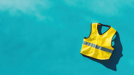 A bright yellow safety vest lays against a vivid blue background, illuminating its reflective strips. The clean design makes it ideal for themes of safety, visibility, and protection in various industries.