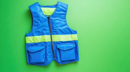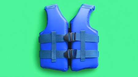 A vibrant blue life jacket positioned on a bright green background, symbolizing safety and fun in water sports, ideal for various recreational activities.