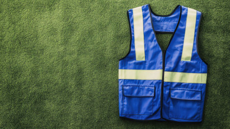 A blue safety vest featuring reflective strips lays on a green grass background, ideal for construction, outdoor work, and visibility in various environments.