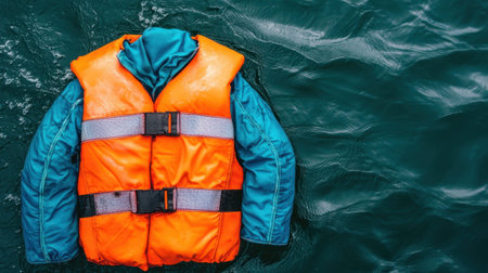 A bright orange life jacket floats on calm blue water, symbolizing safety for various water activities. Essential for boating, kayaking, and swimming.