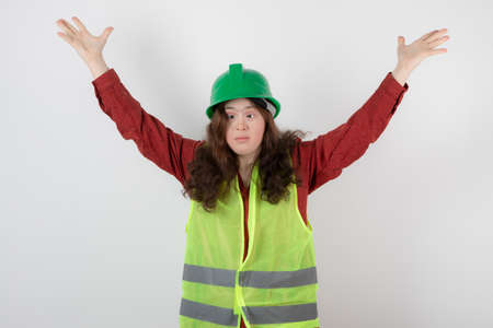 Photo of positive worker lady arm hip look camera wear helmet shirt vest isolated white color background