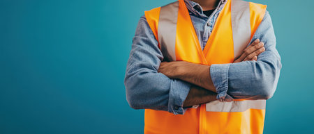 A worker wearing an orange safety vest stands confidently with arms crossed.