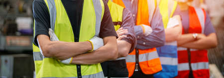 close up half body cropping image banner. Team engineer technician and foreman arms crossed work success, business corporate industry teamwork. technician successful concept.