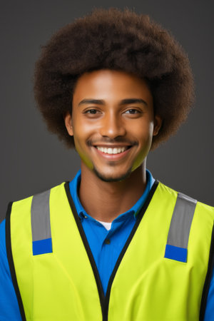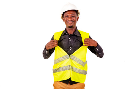 portrait of a young male construction engineer showing his green safety vest while smiling.
