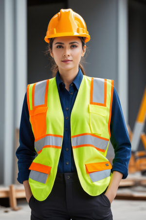 A worker wearing a bright safety vest stands on a construction site, bathed in warm sunlight, highlighting reflective straps and showcasing a professional environment.