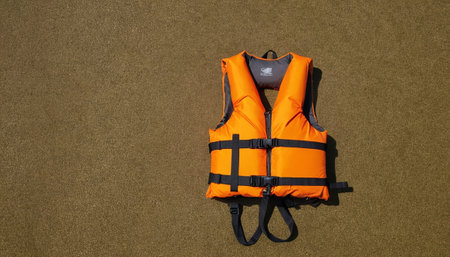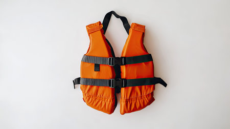 orange life jacket against a white backdrop, showcasing vital safety equipment for boating and swimming. Perfect for child safety.