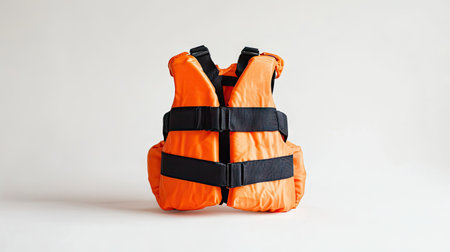 Minimalist photo of a life jacket on a white backdrop, highlighting its safety features and design for effective flotation and visibility
