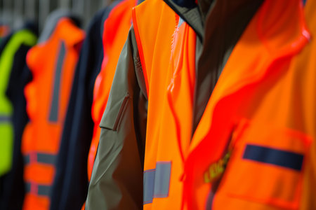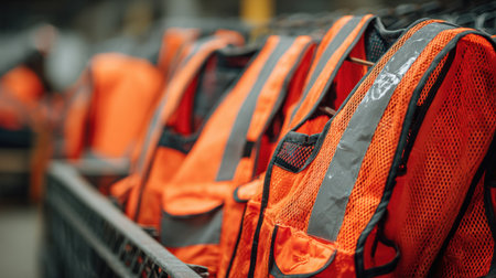 A close-up view of bright orange safety vests neatly arranged in a storage area, emphasizing the importance of safety gear in industrial or construction environments.