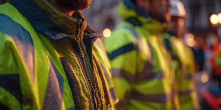 The image features a group of people wearing bright yellow and blue high-visibility jackets. The jackets appear reflective and the focus is on the upper bodies. The composition shows close-up details. The lighting suggests an outdoor or industrial setting. This image could be suitable for various commercial or editorial applications.