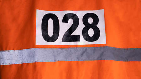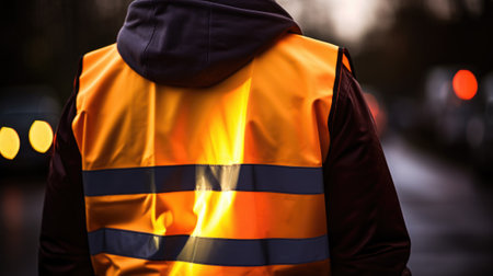 Close-up of a workers back wearing a reflective high-vis safety vest at an industrial site