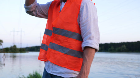 Male engineer holding helmet, posing outdoors with beautiful river on the background. Cropped, close up. High voltage power lines. Energy industry concept. Slow motion
